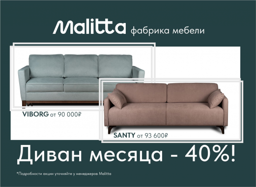 Только в октябре скидка 40% на диваны SANTY и VIBORG в салонах Малитта!