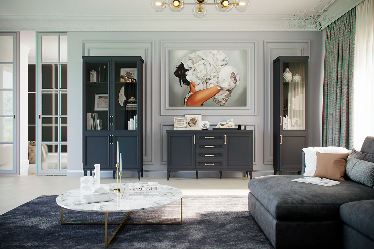 Шкафы укомплектованы полками ЛДСП за глухими фасадами и стеклополками за стеклянными фасадами;
